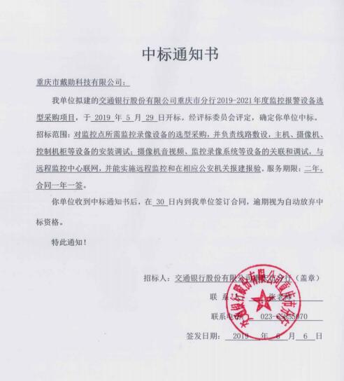 我公司中標:交行重慶市分行2019-2021年度監(jiān)控報警設備選型采購項目